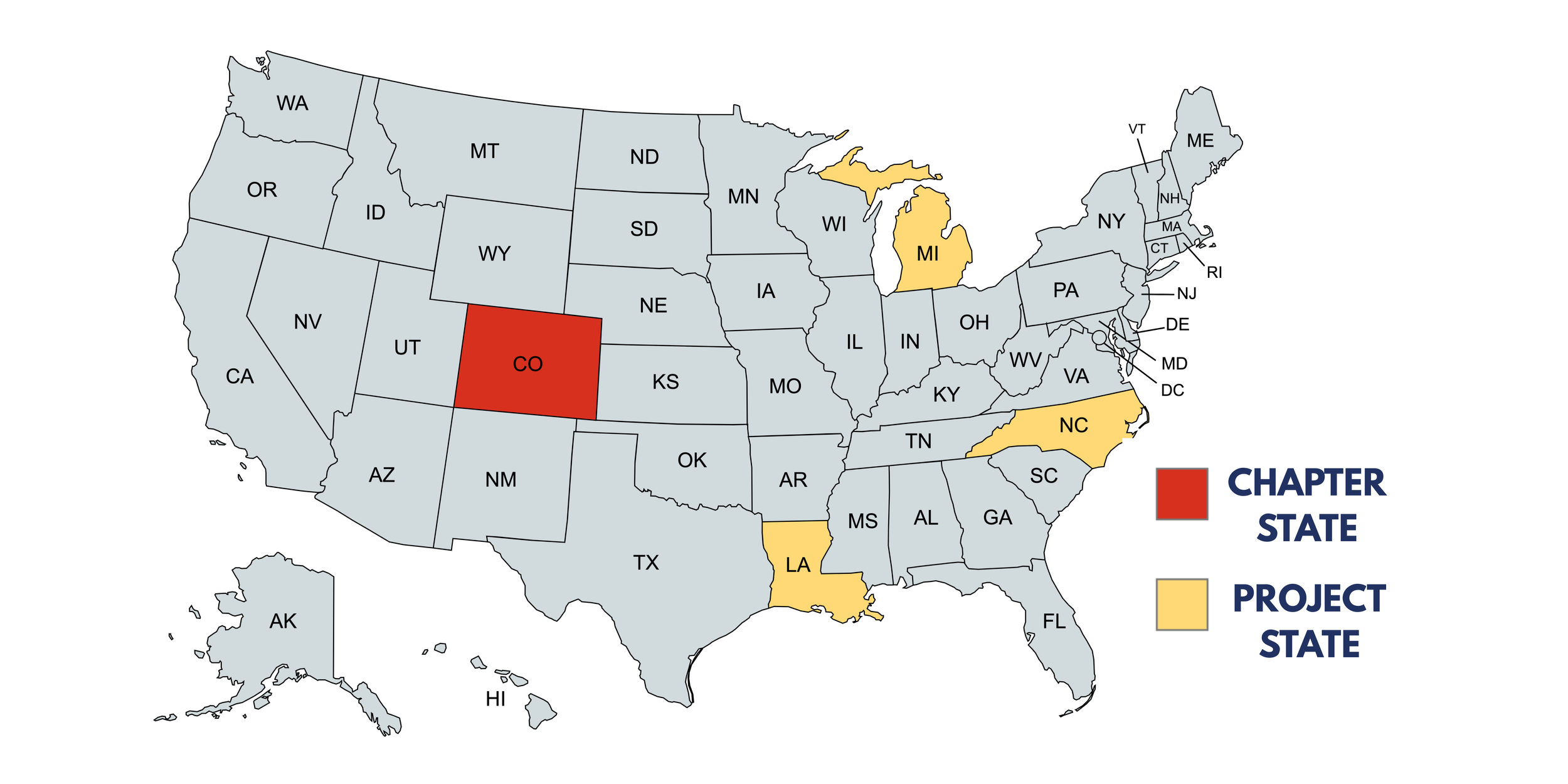 we’re working in four states: CO, LA, NC, and MI. A Chapter State is one in which we have a state-specific organization established, such as Healthier Colorado. Project States are ones where Healthier United is otherwise currently engaging in mission-driven work.